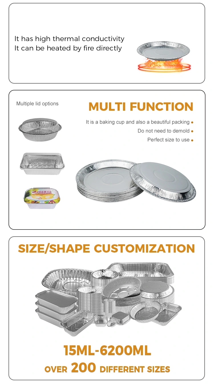 Rassemblements de famille dans les réunions de famille, le récipient en aluminium en aluminium à pizza de 10 pouces en aluminium est sans aucun doute un aide indispensable. Il peut être utilisé pour contenir des plats principaux tels que du poulet rôti et des ragoûts, ou en tant qu'ustensiles jetables pour contenir des aliments restants, ce qui est pratique et rapide pour réduire le fardeau du nettoyage après les repas. De plus, en raison de ses caractéristiques légères et faciles à transporter, il est idéal pour les pique-niques extérieurs.