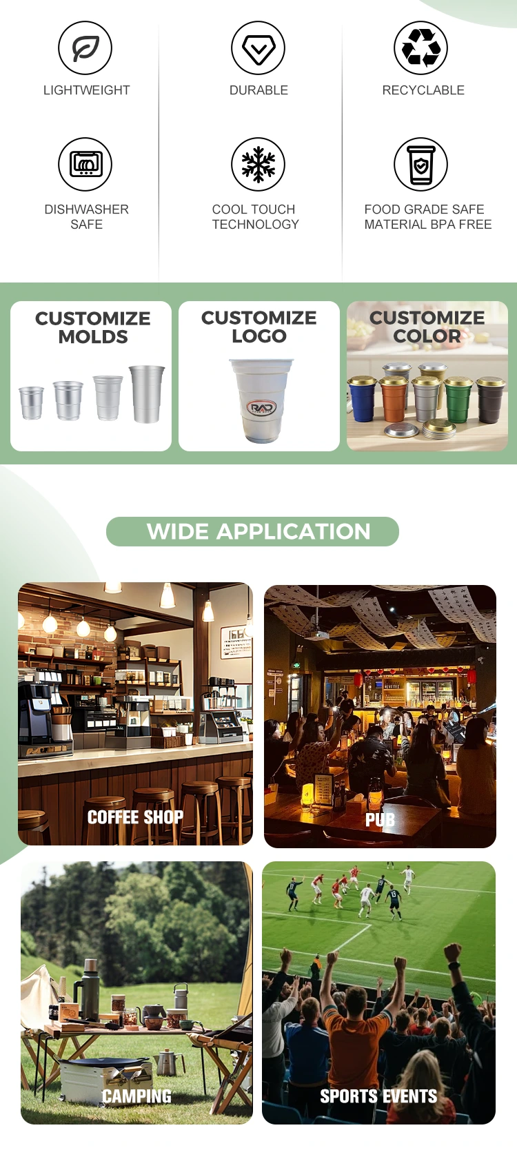 Scénarios d'activités commerciales : expositions, conférences de presse, pauses thé d'affaires et autres occasions. Ce gobelet en aluminium peut être utilisé pour contenir des boissons telles que de l'eau minérale et de l'eau gazeuse. Il est léger et facile à prendre, et son attribut recyclable correspond à l'image de bureau écologique de l'entreprise. Il peut être utilisé pour préparer des mini cocktails, conserver du whisky, etc. dans des bars et des bars clairs. Le corps de la tasse en métal peut transmettre rapidement la fraîcheur, améliorer le goût glacé des boissons et en même temps ajouter un style à la mode à l'atmosphère de la discothèque.