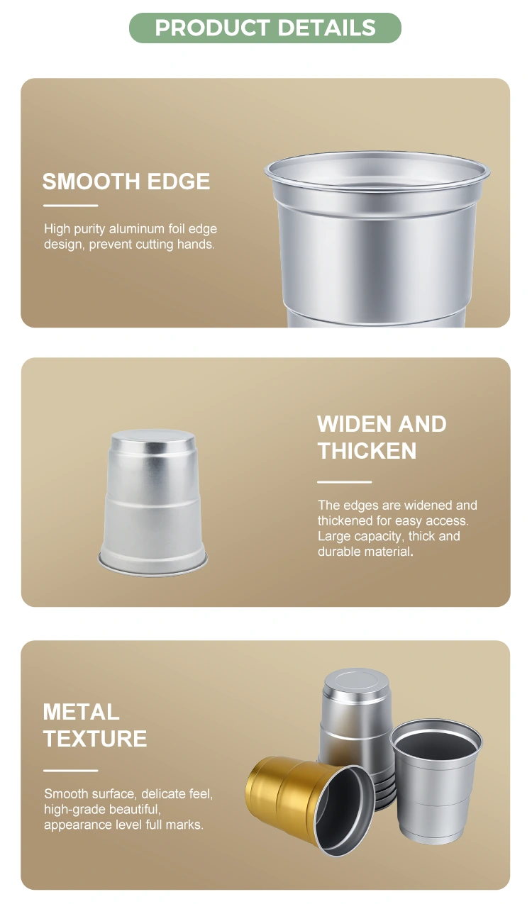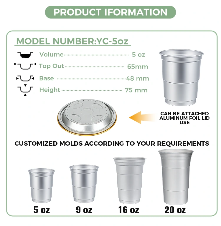 Le gobelet à boisson en aluminium recyclable jetable de 5 oz du fournisseur de papier d'aluminium Yunchu, avec une texture métallique en aluminium simple et élégante, rend ce gobelet à boisson adapté à un large éventail de scénarios, couvrant plusieurs domaines tels que les opérations commerciales, les rassemblements de loisirs, les événements à grande échelle, etc., devenant ainsi la solution préférée pour les emballages basés sur des scénarios :