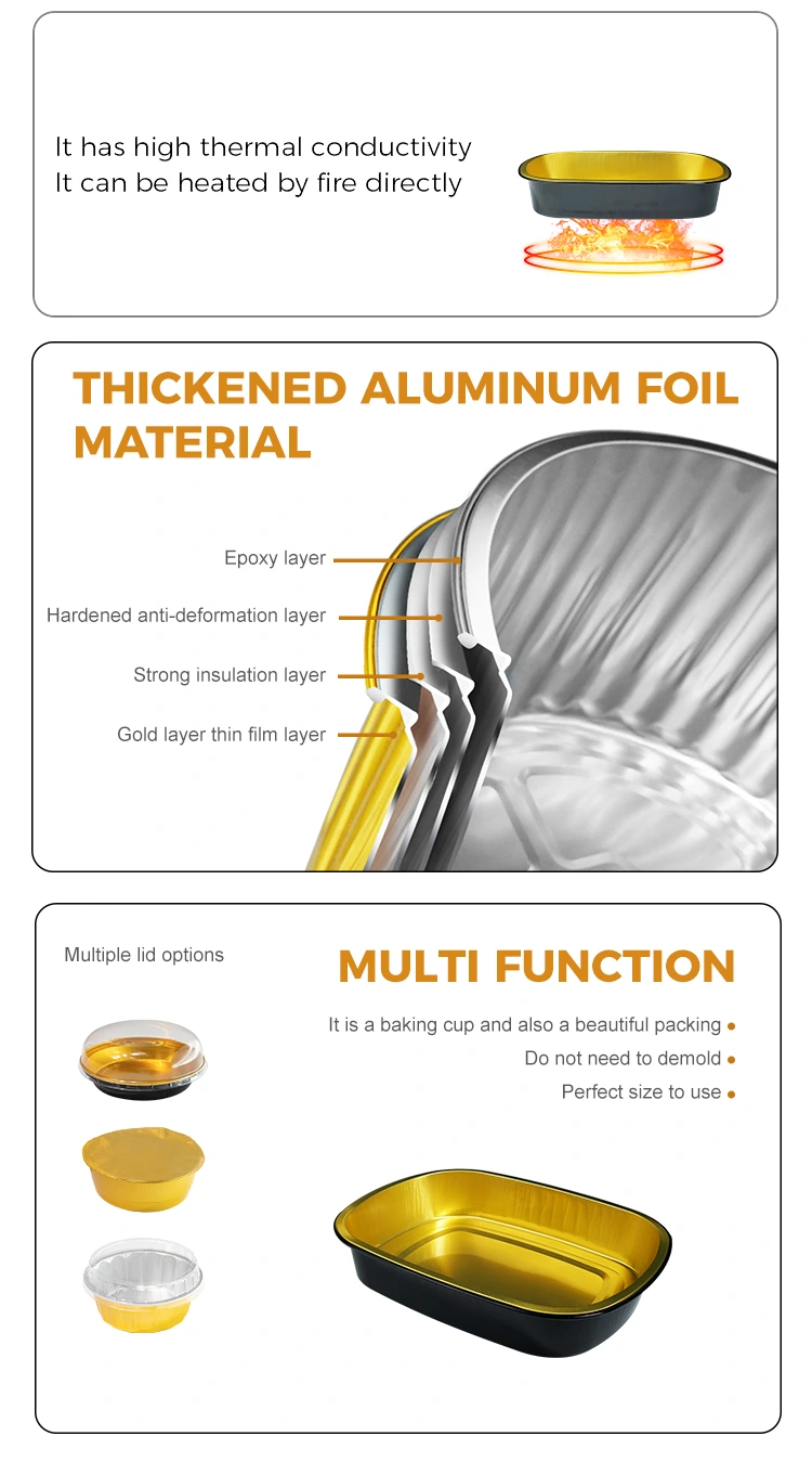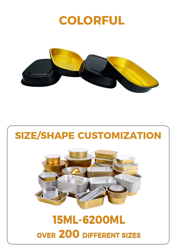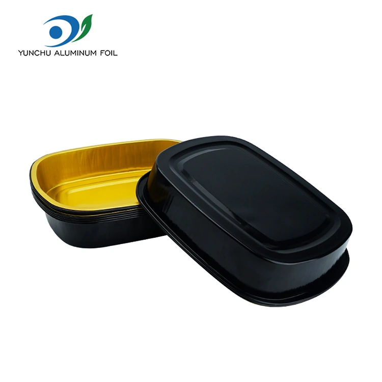 Yunchu Aluminum Foil Supplier Disposable black gold catering Rectangular Aluminum Foil Containers is suitable for large-volume catering and takeaway industries, especially suitable for baking, catering chains and self-service chains and other scenarios, the product is made of 8011 food-grade aluminum foil material, the height is low and suitable for some turkey, grilled fish, stew and other foods with many Les ingrédients à placer peuvent être utilisés avec le couvercle d'étanchéité en aluminium et le couvercle entièrement transparent entièrement transparent, avec d'excellentes performances d'étanchéité, une résistance à haute température et une fonction de prévention de l'huile et des fuites. Il est largement utilisé dans divers scénarios tels que l'emballage alimentaire, le chauffage, la réfrigération et la livraison à emporter. La surface adopte une conception de paroi légère, avec une apparence plate et lisse, ce qui est pratique pour le scellage automatique du film scellé par la chaleur, améliorant ainsi l'efficacité de l'emballage.