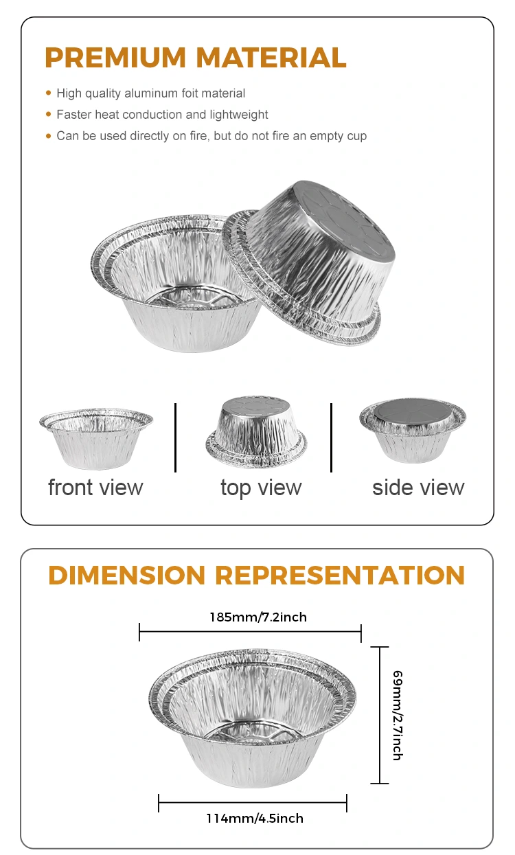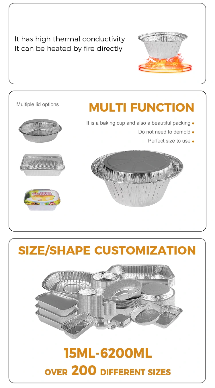Yunchu aluminum foil supplier Round small package baking Silver Aluminum Foil Food Container is made of food-grade aluminum foil material, after the inspection of the company's food certification, the material is thickened, can be made oil-proof and non-sticky, effectively solving the problem of washing the pot, this disposable baked rice takeaway silver aluminum foil container can be used for gas stoves, charcoal fire, Le four, le four à micro-ondes, la boîte entière, peuvent être utilisés sur des flammes ouvertes, le matériau épaissi de la boîte en aluminium n'est pas facile à déformer, les produits de la boîte en aluminium utilisés sont en plastique, et il sera plus pratique à utiliser lors de l'utilisation. La nourriture peut être préparée de diverses manières pour remplir vos conditions de production. Il existe une variété de styles à choisir, pour répondre aux besoins de diverses utilisations, deux types de couvercles à choisir, le couvercle en aluminium transparent, le couvercle plastique, le couvercle transparent n'est pas facile de brouillonner 1 à 2 cm plus haut que la boîte à lunch (ne peut pas être utilisé à haute température), une couverture d'aluminium en aluminium, une couverture de film en aluminium en argent, une surface de papier d'aluminium) peut bloquer les caractéristiques d'huile, plus de conduite et utilisation de la surface d'attelle).