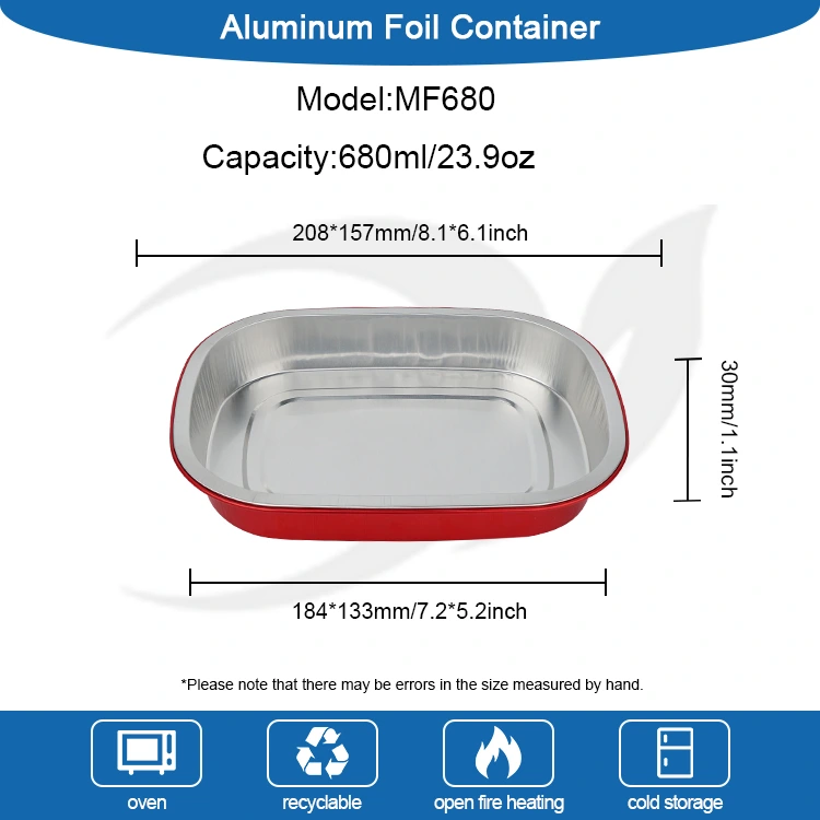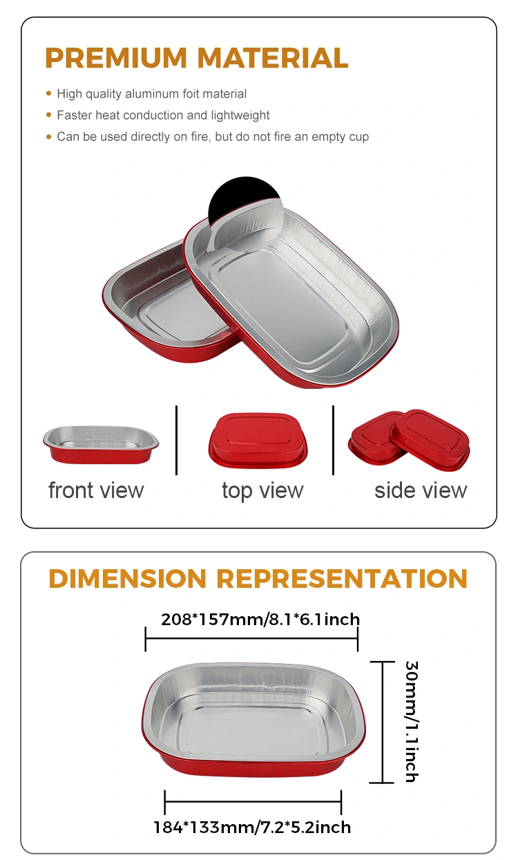 Yunchu est un fabricant et fournisseur professionnel de conteneurs en papier d'aluminium en Chine. Les récipients carrés jetables en papier d'aluminium pour boîte à lunch rouge que nous vous proposons ont un diamètre de 208 * 157 millimètres (8,1 * 6,1 pouces). Le diamètre inférieur est de 184*133 (7,2*5,2 pouces), la hauteur est de 30 (1,1 pouces) et la capacité est d'environ 680 millilitres (23,9 OZ). Il adopte un matériau de base épaissi en feuille d'aluminium de qualité alimentaire 8011, qui prend en compte à la fois la ténacité et la capacité de charge, n'est pas facile à déformer ou à fuir et peut supporter directement les aliments. Il est compatible avec une plage de température ultra-large de -20℃ à 220℃. Aucun démoulage n’est nécessaire. Il peut être directement mis dans le four, la friteuse à air ou le cuiseur vapeur, et peut également être réfrigéré pour être conservé. Il offre une expérience pratique unique de « cuisson – stockage – consommation – élimination ». Le principal avantage du papier d’aluminium est sa conductivité thermique élevée. Le revêtement doré aide à recueillir la chaleur, garantissant que les aliments sont chauffés uniformément et rapidement.