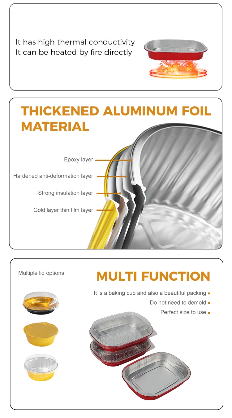 Que vous soyez un boulanger débutant préparant des biscuits et des tartelettes aux œufs, ou un joueur avancé préparant des pâtes et du poisson entier, les récipients carrés jetables en papier d'aluminium pour boîte à lunch rouge peuvent être parfaitement adaptés. Pas besoin de badigeonner d'huile à l'avance. Les ingrédients peuvent être directement mis en pâtisserie. A la sortie du four, ils peuvent être servis directement sur la plaque, éliminant ainsi les problèmes de démoulage et de nettoyage de la plaque à pâtisserie. L'aspect doré rend les produits de boulangerie plus exquis. Cuire une plaque à pâtisserie dorée composée de biscuits aux canneberges et de poulet rôti pendant le festival remplit instantanément l'atmosphère de retrouvailles. Prendre une photo et la partager sur les plateformes de réseaux sociaux sera très accrocheur.