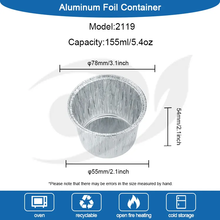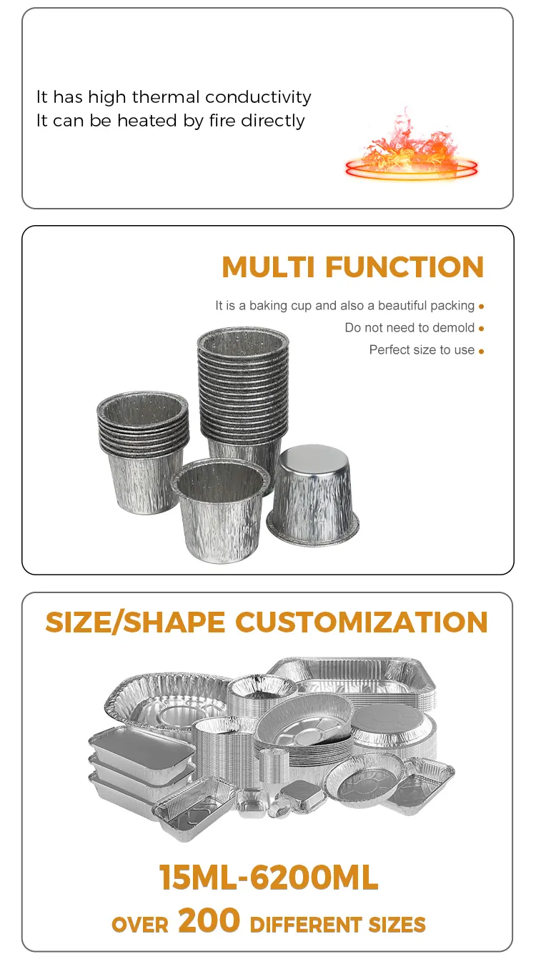 Le récipient en papier d'aluminium argenté jetable pour tasse à gâteau ronde du fabricant de papier d'aluminium Yunchu est fabriqué à partir de papier d'aluminium de haute pureté de qualité alimentaire. Il a subi des tests de qualité stricts et n'a aucune odeur ni additifs nocifs. Le contact direct avec les ingrédients offre plus de tranquillité d'esprit, protégeant chaque bouchée de douceur et de santé. Le processus de feuille d'aluminium épaissi crée un corps de tasse résistant qui n'est pas facile à déformer ou à casser. Il peut être utilisé pour diverses pâtes à gâteaux, mousses, puddings et autres ingrédients.