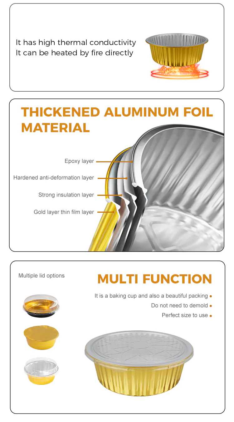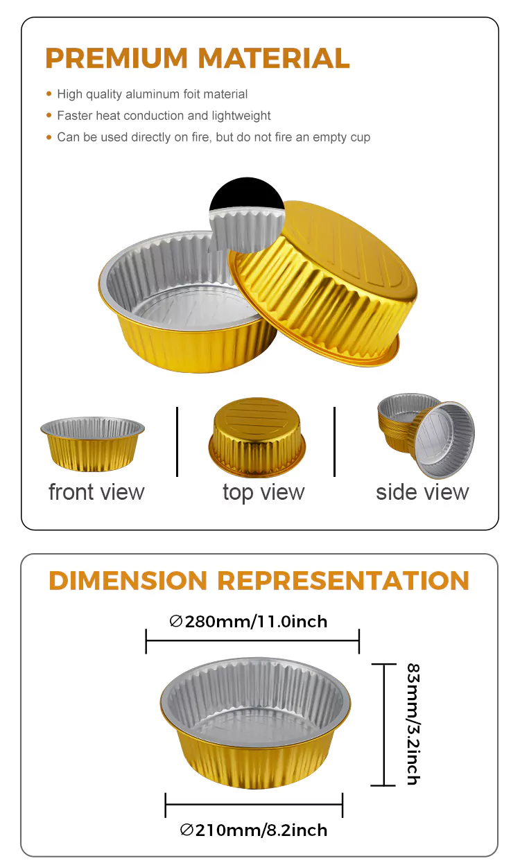Le papier d'aluminium Yunchu vous fournit des récipients en papier d'aluminium doré ronds jetables de grande capacité de haute qualité. Nous avons adopté un design d'apparence accrocheur, ce qui les rend à la fois de haut niveau d'apparence et de praticité. Les scénarios d'application incluent les cuisines domestiques, les entreprises de restauration, les ateliers de pâtisserie, etc.