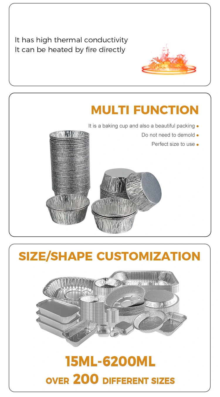 Récipient en papier d'aluminium argenté pour friteuse à air à sauce ronde jetable du fournisseur de papier d'aluminium Yunchu Le papier d'aluminium argenté a une texture épaisse et n'est pas facilement endommagé ou déformé. Même s'il contient des sauces épaisses et des ingrédients soupes, il peut être maintenu fermement sans fuite ni effondrement. Les bords ont été renforcés et pressés, ce qui les rend doux au toucher, ne vous grattera pas les mains et est plus sûr à manipuler. Conception jetable, jeter après utilisation, vous évitant ainsi d'avoir à nettoyer le récipient. Cela peut non seulement améliorer l'efficacité, mais également garder l'environnement propre et bien rangé dans des scénarios tels que les emballages à emporter, les magasins de restauration, le camping et les pique-niques. De plus, le matériau en feuille d'aluminium est recyclable, écologique et respectueux de l'environnement, et il ne causera pas trop de charge environnementale s'il est jeté après utilisation, en tenant compte de la commodité et de la protection de l'environnement.