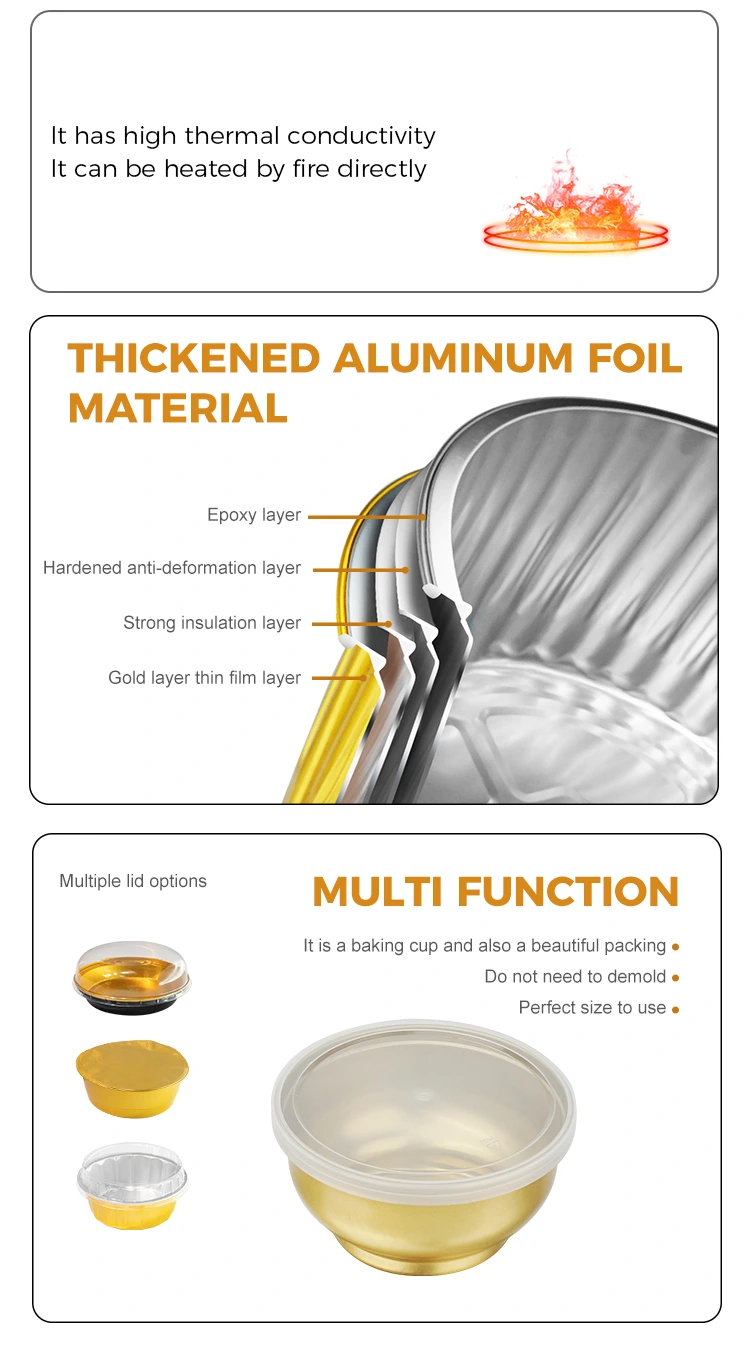 Fournisseur de papier d'aluminium Yunchu, petit bol rond jetable en or, récipients en papier d'aluminium, papier d'aluminium épaissi, haute dureté, pas facilement déformable, peut être scellé sans fuite, forte résistance à la chaleur, réutilisable, servant à la fois de moule et d'emballage, l'emballage en papier d'aluminium de stérilisation à haute température est sûr, hygiénique et possède de bonnes propriétés d'isolation thermique - forte résistance à la chaleur - peut être cuit à la vapeur, réfrigéré, congelé et recyclable. Membrane intérieure en PE de qualité alimentaire, matériau métallique associé à une membrane intérieure en PE de qualité alimentaire, corps de pot épais incolore et inodore qui rend le petit pot difficile à déformer, offrant une bonne protection, une sécurité et une fiabilité d'étanchéité élevées, le bouchon de la bouteille se combine étroitement avec le corps de la bouteille, une forte étanchéité maintient la fraîcheur du produit pendant plus longtemps, des matériaux complètement nouveaux qui sont sûrs, respectueux de l'environnement et inodores. Les récipients jetables en papier d'aluminium à petit bol rond en or sont largement utilisés dans diverses industries alimentaires telles que les usines alimentaires, les usines de bonbons, les usines de fruits secs, les boulangeries, les magasins d'alimentation spécialisés et les magasins de tri de fruits secs, etc. Ils sont utilisés pour contenir des aliments, des bonbons, du miel, des prunes séchées, des fruits secs, des écorces de mandarine vieillies, des essences solides, liquides et solides.