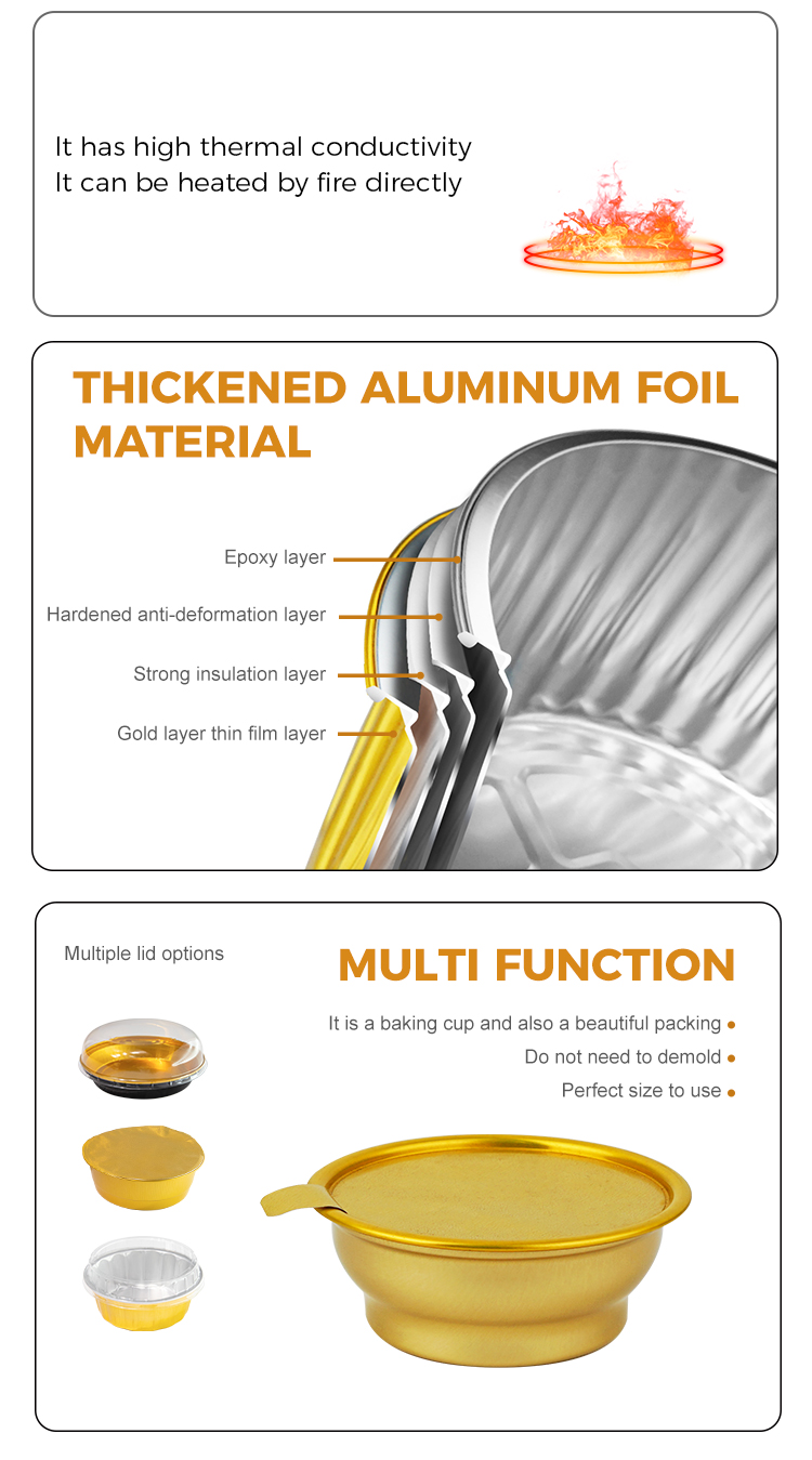 La boîte à emporter ronde jetable du fabricant de papier d'aluminium Yunchu, petit bol doré, les conteneurs en papier d'aluminium sont fabriqués à partir de papier d'aluminium de qualité alimentaire et traités selon des étapes de production strictes pour garantir la propreté et l'hygiène, offrant ainsi aux clients une tranquillité d'esprit lors de leur utilisation. Boîte à emporter ronde jetable petit bol doré Les récipients en papier d'aluminium sont non seulement résistants à la cuisson à la vapeur à haute température, forts en compression, mais empêchent également les problèmes tels que les fuites d'air ou les renflements. Sa performance environnementale est garantie dans une certaine mesure, il n'est pas facile à rouiller et présente une conception à large ouverture. Il peut également être équipé de différents couvercles en aluminium, tels que des couvercles faciles à tirer ou des couvercles détachables, permettant aux usines de conditionnement alimentaire d'emballer facilement les aliments. De plus, il y a un revêtement protecteur à l’intérieur qui peut entrer en contact direct avec les aliments, ce qui le rend approprié pour stocker divers types d’ingrédients.