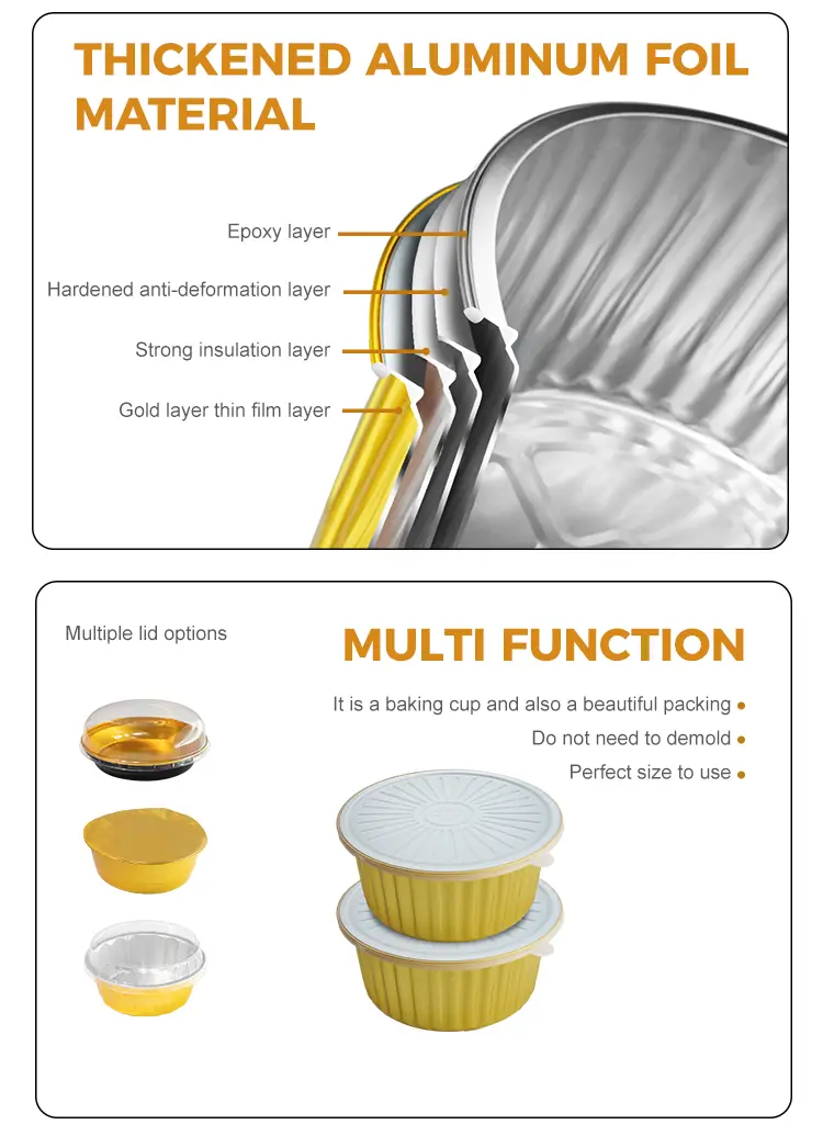 Aluminium Yunchu Foil en aluminium jetable scellable Golden Round Round Foil Containers Conters CF5000 Alimentation en gros a une large gamme d'utilisations, peut utiliser le couvercle d'étanchéité de la chaleur en aluminium couvert pour la cuisson, le stockage, le transport et la fourniture de toutes les aliments pour les aliments, ce contes Les magasins, les fêtes de vacances, les activités de restauration, les magasins de restauration en libre-service, etc., conteneurs en aluminium rond doré scelables en aluminium en aluminium de haute qualité 8011-0, aluminium, plateau à pâtisserie jetable avec couvercle est durable, pas facilement ponctué ou endommagé; Le matériau permet une distribution uniforme de la chaleur, une bonne rétention de chaleur, pas d'adhésivité, pas de brûlure, d'étanchéité et d'étanchéité à l'huile, pas besoin de nettoyer, pas de charge sur les taches d'huile. Les bords lisses ne vous blessent pas les mains, garantissant que les plats préparés sont entièrement cuits; La casserole en aluminium est finie dans une couleur dorée élégante qui améliore la présentation et complète votre cuisine ou votre décoration d'événements.