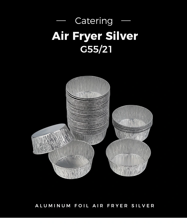 • Récipients alimentaires argentés jetables de papier d'aluminium de friteuse d'air d'immersion ronde argentéeRécipients alimentaires argentés jetables de papier d'aluminium de friteuse d'air d'immersion ronde argentée