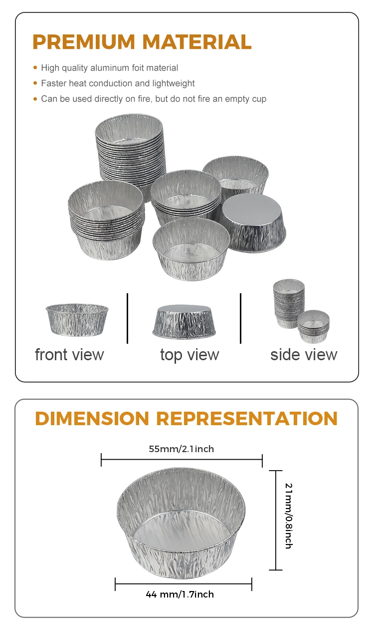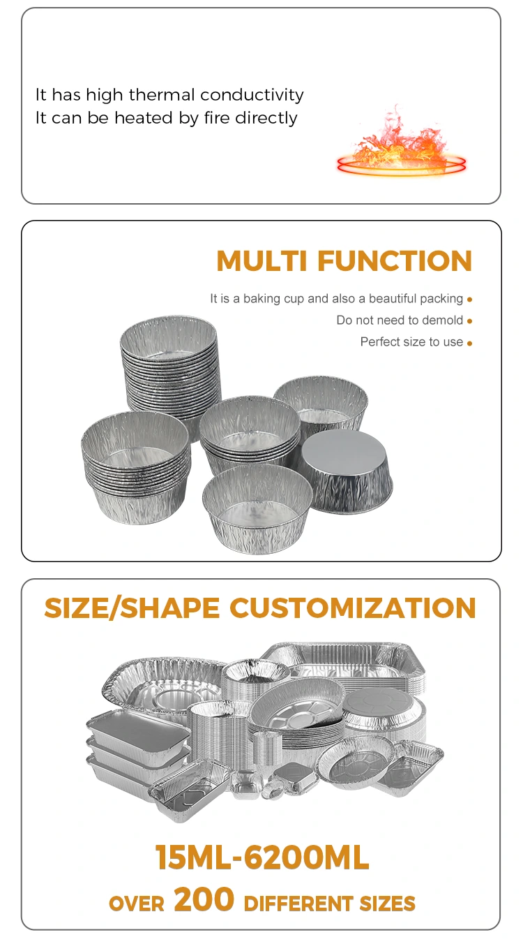 Le récipient jetable en papier d'aluminium argenté pour friteuse à air ronde argentée du fournisseur de papier d'aluminium Yunchu est conçu pour être jetable, éliminant complètement la tâche fastidieuse de laver la vaisselle après les repas, économisant du temps et de l'énergie ; le matériau en feuille d'aluminium est recyclable, respectueux de l'environnement et sans charge, en tenant compte des concepts pratiques et écologiques. Apparence petite et exquise, le rangement empilable ne prend pas de place, économisant facilement de l'espace de rangement dans la cuisine. Qu'il soit utilisé à la maison ou dans les entreprises, ce récipient jetable rond en aluminium argenté peut résoudre le problème du stockage et de l'utilisation des trempettes avec des matériaux de haute qualité et un design réfléchi, rendant chaque cuisine et chaque réunion plus sans souci et plus confortable.