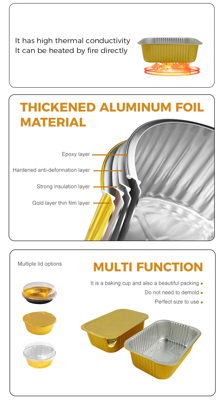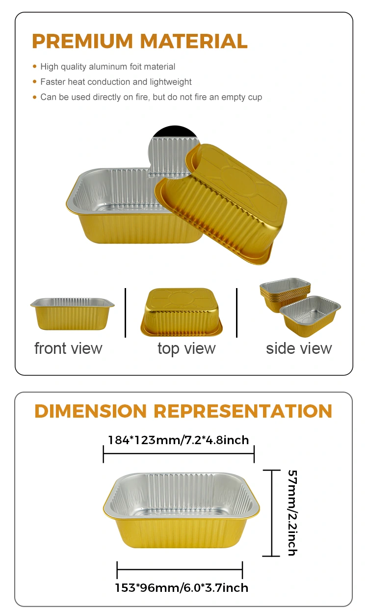 Fournisse en aluminium Yunchu Fournisseur de sceau carré jetable gratin gratin en aluminium en aluminium Conteneurs est soigneusement composé de matériau d'aluminium de haute qualité de qualité alimentaire, qui peut être utilisé avec un couvercle d'étanchéité en aluminium, qui a d'excellentes performances d'étanchéité, une résistance à haute température et une résistance à l'huile et aux fuites. Il est largement utilisé dans divers scénarios tels que l'emballage alimentaire, le chauffage, la réfrigération et la livraison à emporter. La surface est conçue avec une paroi légère, et l'apparence est plate et lisse, ce qui est pratique pour le scellement automatique du film de scellage de chaleur, afin d'améliorer l'efficacité de l'emballage.