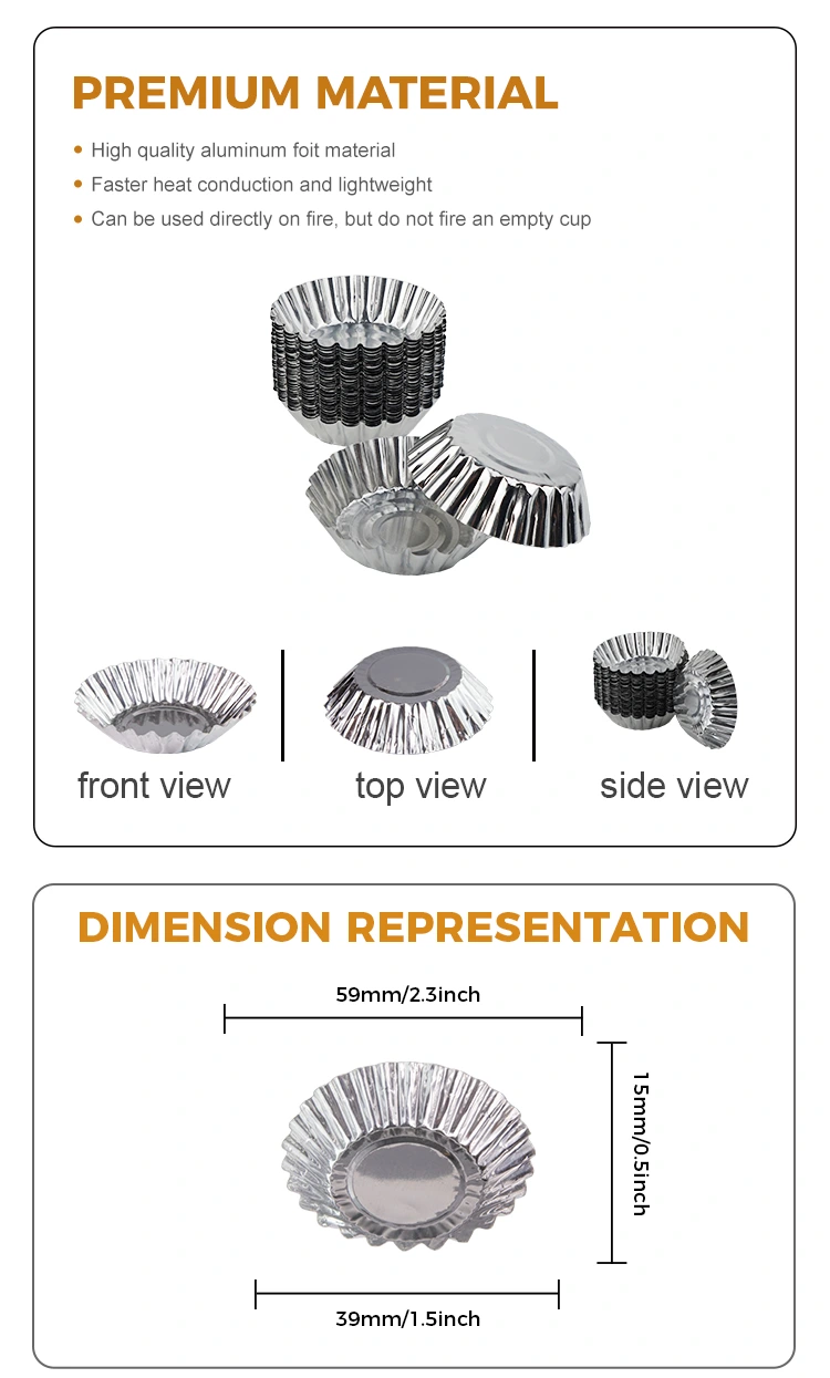Yunchu – tarte aux œufs en aluminium, cuisson de toasts, récipient alimentaire en papier d'aluminium argenté, produit en gros conçu pour les tartes aux œufs et autres desserts. Il est fait de papier d'aluminium de qualité alimentaire, sûr et non toxique, et possède une bonne conductivité thermique, garantissant que les aliments sont chauffés uniformément et ont un meilleur goût pendant le processus de cuisson. Ce plateau à tarte aux œufs est polyvalent et convient à diverses occasions telles que les réunions de famille, les événements professionnels, etc. Facile à retirer le moule à haute température lors de l'utilisation, une fois le produit fini terminé, facile à retirer le film, fond antiadhésif, n'endommage pas la forme, épaissit et durcit le matériau qui n'est pas facile à déformer, bonne résistance à la pression, dites adieu aux problèmes de lavage du pot et protégez facilement le pot, isolez les taches d'huile sans nettoyage après utilisation, le fond lisse n'est pas facile à brûlent et collent au fond, les aliments antiadhésifs sont faciles à cuisiner, le fond est lisse, peut résister à -20 °C ~ 300 °C, peut être chauffé sur une flamme nue et le moule est chauffé uniformément.