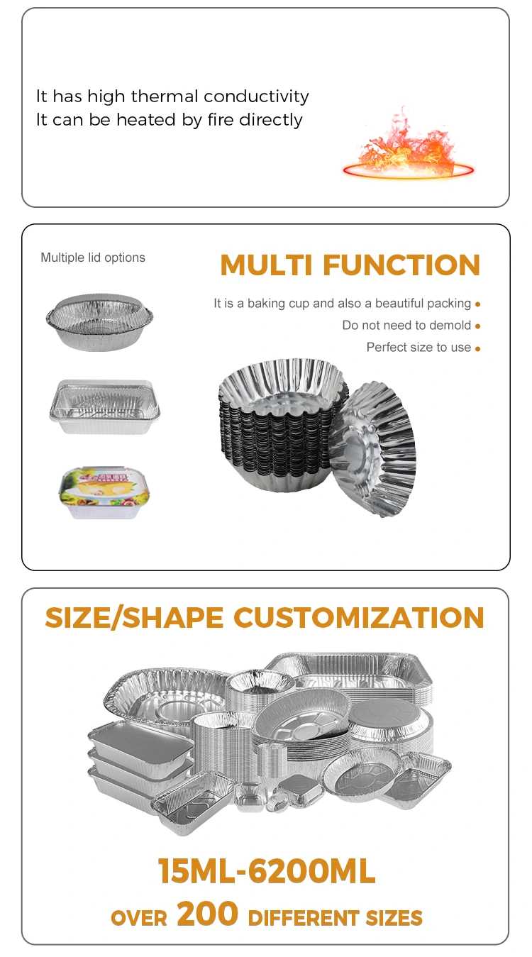 Yunchu Aluminium Egg Tarte Toast Baking Récipient alimentaire en papier d'aluminium argenté en gros conçu pour les tartes aux œufs et autres desserts. Il est fait de papier d'aluminium de qualité alimentaire, sûr et non toxique, et possède une bonne conductivité thermique, garantissant que les aliments sont chauffés uniformément et ont un meilleur goût pendant le processus de cuisson. Ce plateau à tarte aux œufs est polyvalent et convient à diverses occasions telles que les réunions de famille, les événements professionnels, etc. Facile à retirer le moule à haute température lors de l'utilisation, une fois le produit fini terminé, facile à retirer le film, fond antiadhésif, n'endommage pas la forme, épaissit et durcit le matériau qui n'est pas facile à déformer, bonne résistance à la pression, dites adieu aux problèmes de lavage du pot et protégez facilement le pot, isolez les taches d'huile sans nettoyage après utilisation, le fond lisse n'est pas facile à brûlent et collent au fond, les aliments antiadhésifs sont faciles à cuisiner, le fond est lisse, peut résister à -20 °C ~ 300 °C, peut être chauffé sur une flamme nue et le moule est chauffé uniformément.