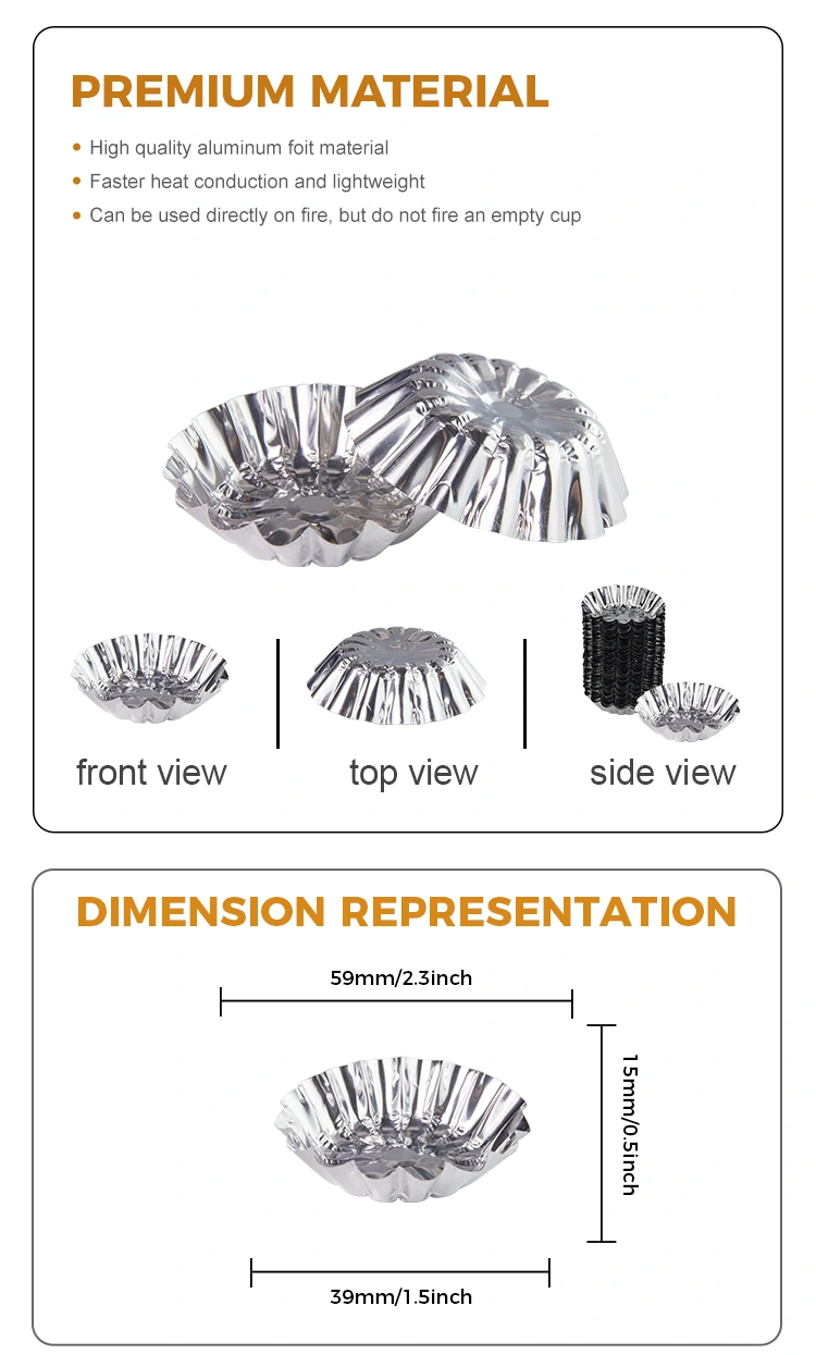 Les tartes d'oeufs du fournisseur d'oeufs du fournisseur d'œufs d'aluminium yunchu sont cuits dans un récipient alimentaire en aluminium en aluminium en aluminium, un corps à gobele Cripps, gâteaux de bol et autres spécialités. Yunchu a réussi la certification ERP allemande, la certification UE SGS et la certification du système de gestion de la qualité ISO9001. Nous utilisons des matériaux de qualité alimentaire sains et respectueux de l'environnement pour assurer la sécurité et la non-toxicité de nos produits. Ces matériaux sont non seulement renouvelables mais également respectueux de l'environnement, reflétant nos exigences strictes en matière de sécurité alimentaire et notre engagement à poursuivre des normes de haute qualité pour nos produits globaux.