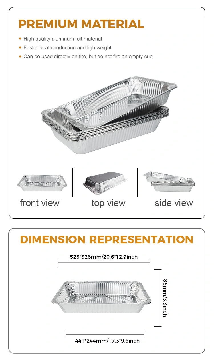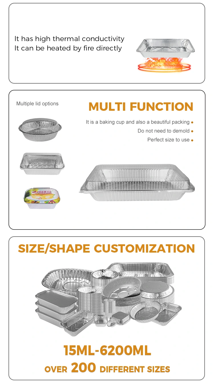 Caractéristiques: Ce récipient en feuille de boulangerie extérieur de grande capacité est composé de matériau en aluminium 8011-0 de qualité alimentaire, qui répond pleinement à la norme de contact de qualité alimentaire, garantissant la sécurité alimentaire sans odeur particulière, et plus assurée à utiliser. Il a une conception intérieure concave et convexe, qui est plus sûre à utiliser. L'équipement est exempt de nettoyage et protège bien la doublure de l'équipement. Qu'il s'agisse de cuisson ou de chauffage sur une flamme ouverte, il n'est pas nécessaire de s'inquiéter de la déformation des récipients ou d'affecter la sécurité alimentaire.