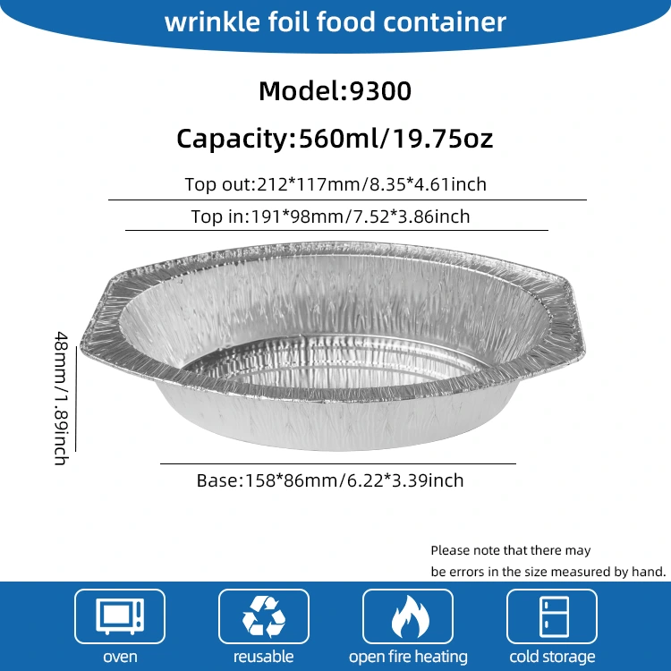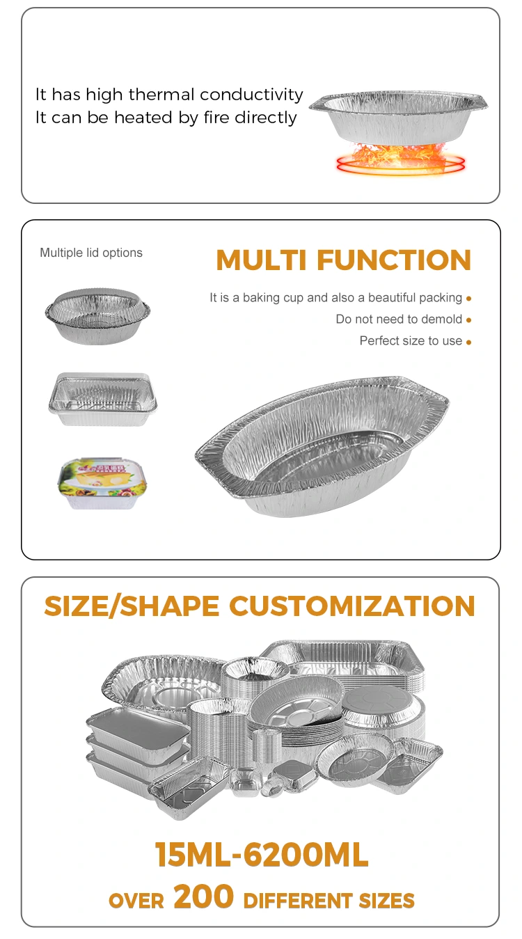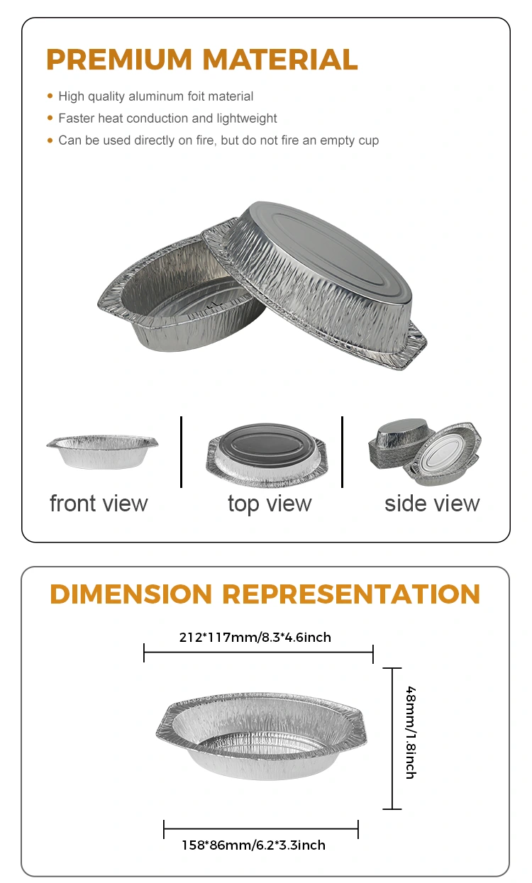 Le fournisseur de papier d'aluminium Yunchu propose des contenants d'aluminium en aluminium en aluminium argenté ovale pour la cuisson maison, les boulangeries, les chaînes de magasins et la livraison de nourriture réfrigérée. Fabriqué à partir de matériau en papier d'aluminium de qualité alimentaire, ce conteneur présente une forme ovale unique qui le fait ressortir parmi les nombreuses boîtes de cuisson en argent. Ce récipient convient particulièrement pour tenir des mouchoirs chauds, des fruits, du pain et toutes sortes d'aliments de réplique, et peut répondre aux besoins d'une large gamme de vaisselle. En raison de sa bonne conductivité thermique, il peut également dissiper les températures élevées, garantissant que les aliments sont chauffés uniformément. De plus, il a une certaine capacité de charge et une résistance à la pression, en maintenant la stabilité même dans le cas de plusieurs piles, empêchant la déformation et est idéale pour une utilisation pendant le transport. Afin de mieux s'adapter à différents scénarios et besoins, ce conteneur peut également être personnalisé en fonction des exigences du client et fournir des couvercles assortis pour plus de praticité.