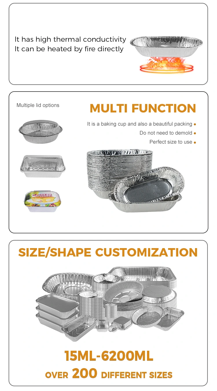 En raison de sa conception petite et légère, ce récipient d'alimentation en aluminium en aluminium argent rôti ovale est parfait pour transporter et stocker des aliments, adaptés à l'utilisation et à la personnalisation des magasins d'aliments dans les magasins, les restaurants de restauration rapide, etc. La conception de texture concave et convexe au fond aide à améliorer la friction et à distribuer la chaleur uniformément et à éviter la surchauffe locale. De plus, la boîte en aluminium a été épaissie pour améliorer la résistance et la durabilité de compression, et elle peut rester stable même pendant le transport et n'est pas facile à déformer.