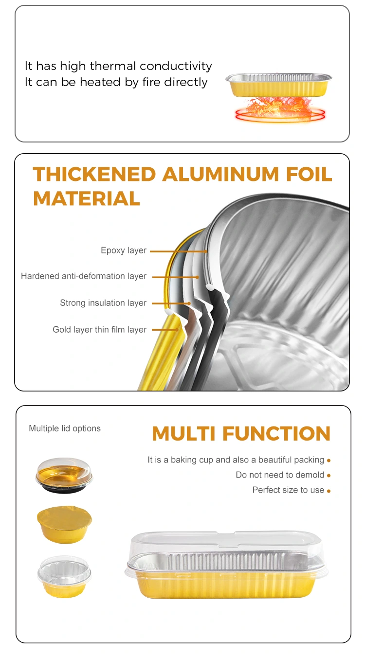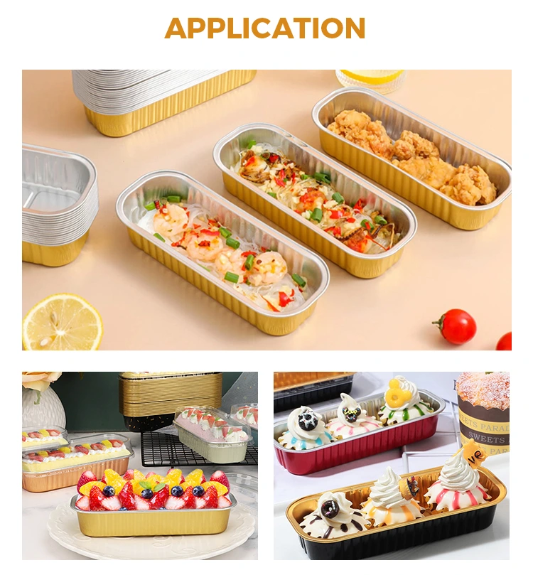 Yunchu aluminum foil supplierRectangular baking cake Smoothwall Aluminum Foil Containers is made of 8011 food-grade aluminum foil material, choose to store in the refrigerator with lid, aluminum foil lid and PET fully transparent plastic lid, cannot be used in air fryer, oven and other equipment, universal design air fryer, oven, steamer can be used with various equipment, can be reused hygienic Et respectueuse de l'environnement, la conception concave et convexe en bas augmente non seulement la stabilité du produit, mais joue également un rôle dans l'anti-glissement; Les raidisseurs sur les côtés améliorent la robustesse du produit, ce qui le rend plus durable, et en outre, ce récipient en aluminium à parois légères rectangulaires offre une variété de couleurs à choisir, vous permettant de la personnaliser en fonction de vos préférences.
