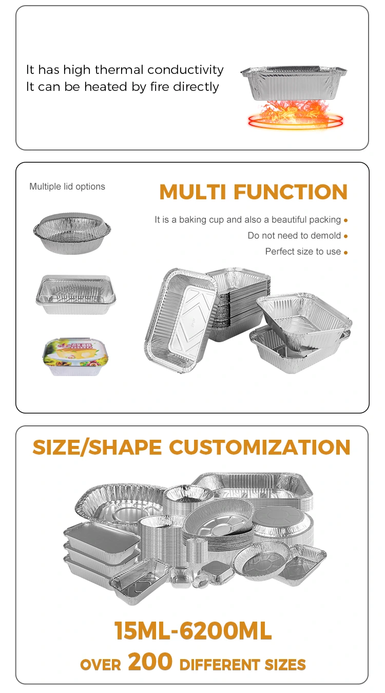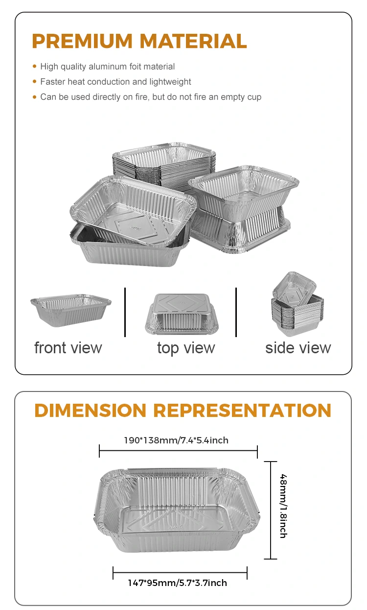 Les boîtes à lunch en papier d'aluminium que nous proposons sont fabriquées à partir d'un matériau en feuille d'aluminium 8011, qui possède d'excellentes propriétés d'isolation thermique et peut maintenir efficacement la température des aliments. En particulier, notre récipient rectangulaire en aluminium argenté pour la cuisson des boîtes à lunch possède non seulement des propriétés de conservation de la chaleur, mais peut également être utilisé avec un couvercle en aluminium pour faciliter la personnalisation personnalisée du LOGO.