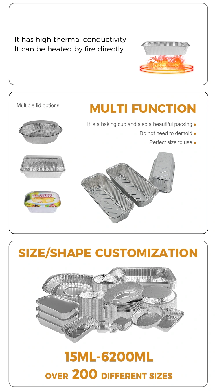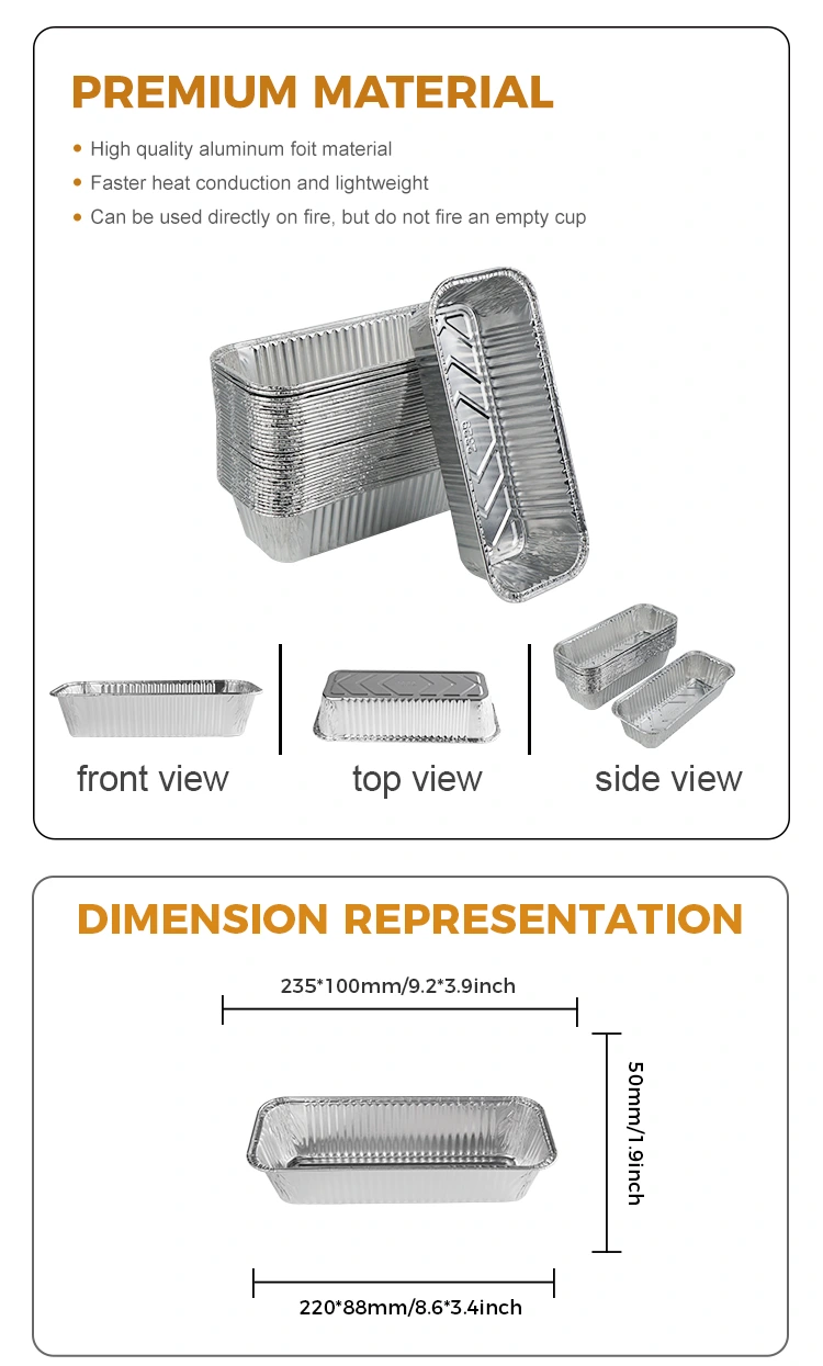 Les conteneurs en papier d'aluminium en aluminium en aluminium à pain rectangulaires fournis par le fournisseur d'aluminium Yunchu en aluminium sont disponibles dans une variété de tailles et de spécifications, adaptées à toutes sortes d'équipements de pot. Qu'il s'agisse d'un grand gril ou d'un petit four à domicile, il peut le gérer facilement. Il est disponible dans une variété de tailles et peut répondre aux besoins de divers barbecues à flammes ouvertes, qu'il s'agisse d'un barbecue en plein air ou d'une utilisation temporaire comme plat, il n'y aura pas de problème.