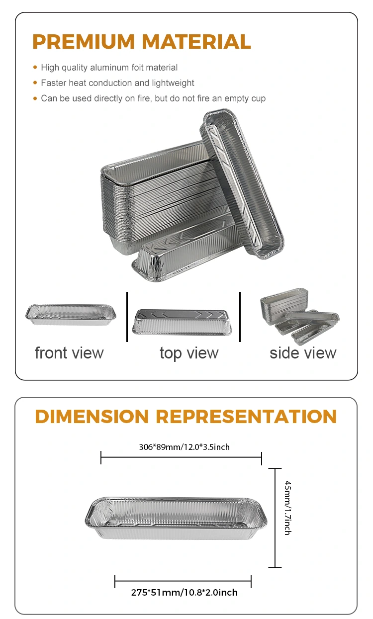 Le plateau à pain rectangulaire cuit argenté en aluminium en aluminium en aluminium fourni par le fournisseur d'aluminium Yunchu en aluminium est composé de matériaux de qualité alimentaire et convient à une variété de scénarios d'application. Ce produit est particulièrement adapté à des fins de grillade et de cuisson, comme la fabrication de longs pains de pain ou de cuisson. Que ce soit pour les grillades au charbon de bois ou comme boîte de livraison à emporter, il est parfait pour une utilisation.