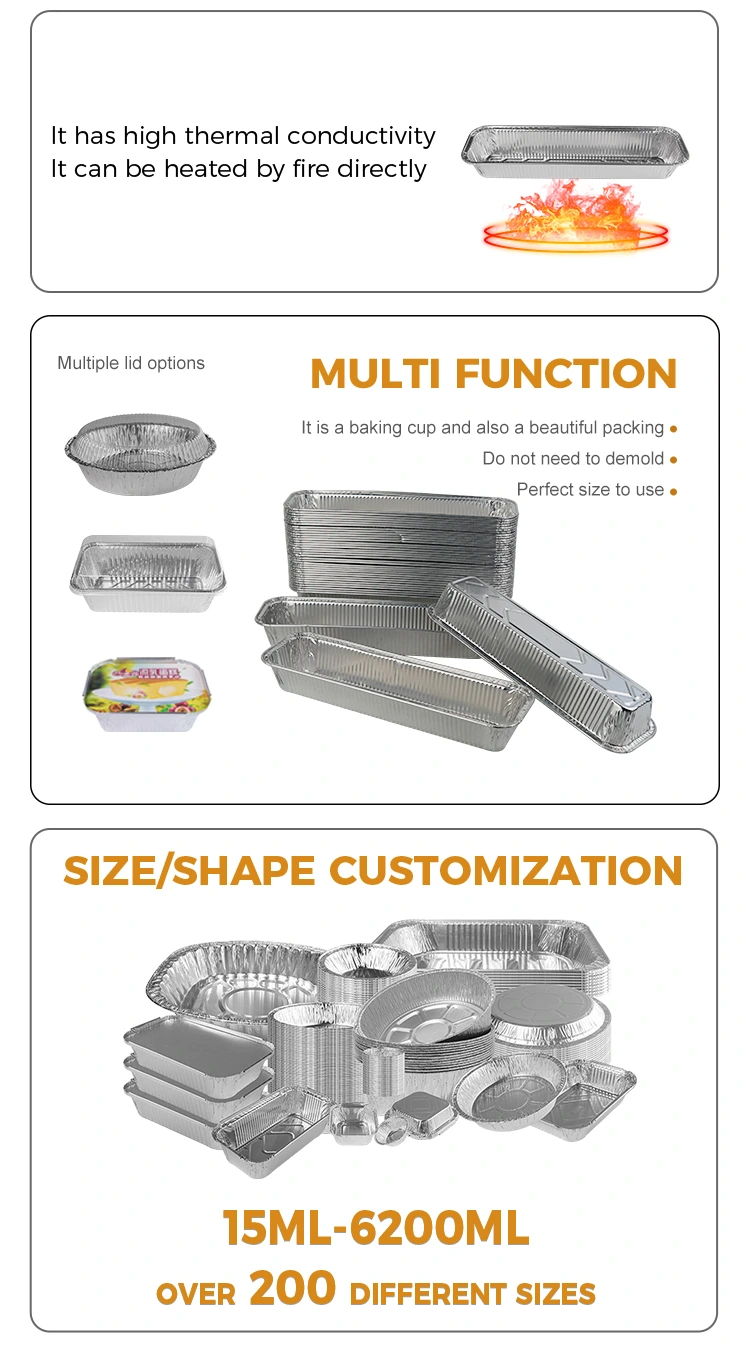 Fournisse en aluminium Yunchu Fournisseur de pain rectangulaire Baking Silver en aluminium en aluminium, une variété de méthodes de chauffage, vous pouvez profiter de la joie de la cuisson à tout moment, une isolation plus efficace et une fraîcheur, une conception améliorée et épaissie, des matériaux sélectionnés de haute qualité pour la protection environnementale et l'hygiène, la conduite de la conduite en aluminium de la carrosse Pour brûler le fond, la nourriture est mieux démoulée, le produit est largement utilisé dans le domaine du barbecue et de la cuisson, en particulier adapté au camping, à la boulangerie, aux stands de barbecue, à la livraison à emporter et aux restaurants de sushi et autres occasions. Il est conçu pour répondre aux besoins pratiques de la plupart des ménages et des magasins.