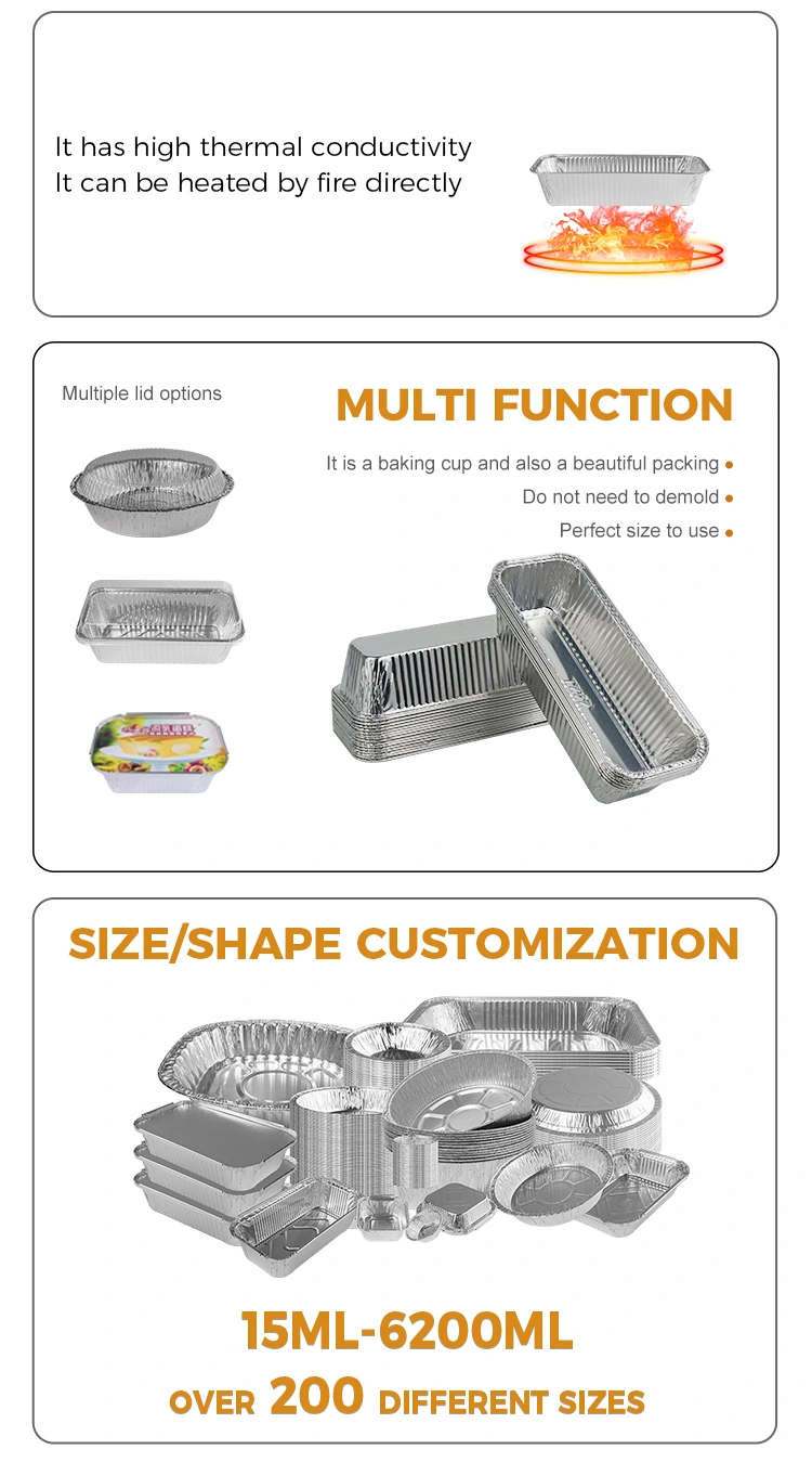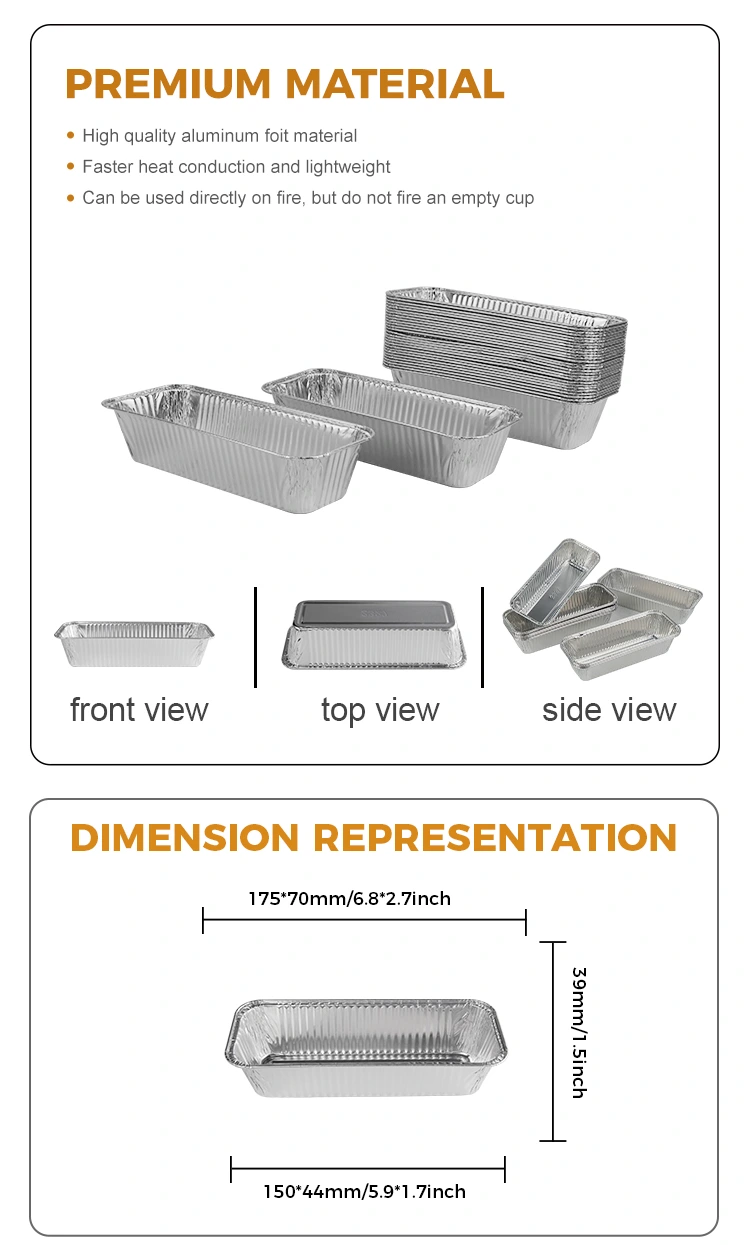 Les conteneurs en aluminium en aluminium argenté à pain rectangulaire fournis par le fournisseur d'aluminium Yunchu en aluminium sont fabriqués en matériaux de qualité alimentaire et conviennent à une variété de scénarios d'application. Ce produit est particulièrement adapté à des fins de grillade et de cuisson, comme la fabrication de longs pains de pain ou de cuisson. Que ce soit pour les grillades au charbon de bois ou comme boîte de livraison à emporter, il est parfait pour une utilisation.