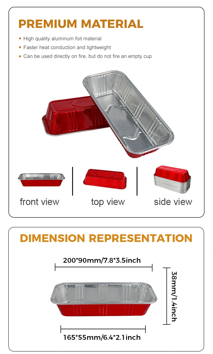 Les conteneurs rectangulaires en papier d'aluminium argenté de restauration de boulangerie rouge du fournisseur de papier d'aluminium Yunchu présentent une conception durable et allant au four. Ils restent stables même à des températures élevées et à des flammes nues, résistant à des températures supérieures à 220 ℃, offrant une répartition uniforme de la chaleur pour éviter les brûlures et offrant une forte étanchéité pour conserver la fraîcheur (empêchant l'air et l'humidité, gardant le pain doux même après refroidissement). Ils offrent également des avantages environnementaux et esthétiques. Fabriqués à partir de papier d'aluminium de qualité alimentaire, ils répondent aux normes de recyclage des emballages et peuvent être recyclés par des filières légitimes après élimination, réduisant ainsi le fardeau environnemental des contenants en plastique à usage unique. La forme allongée s'adapte précisément aux dimensions des longues miches de pain, conservant la forme de la pâte et empêchant l'expansion et la déformation pendant la cuisson. Cela garantit que le pain conserve son aspect intact et allongé après la cuisson, ce qui donne lieu à une présentation du produit plus attrayante visuellement, particulièrement adaptée aux environnements commerciaux.