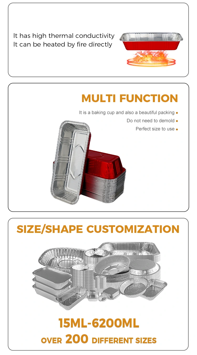 En pâtisserie maison, utilisez des récipients rectangulaires en aluminium argenté de boulangerie rouge pour réaliser de longues bandes de pain, sans vous soucier que la pâte colle à l'assiette ou ne brûle, et obtenez facilement un produit à la fois beau et savoureux ; Lors de la préparation du petit-déjeuner, le pain distribué la veille au soir peut être directement chauffé au micro-ondes le matin et accompagné de lait pour un repas rapide et nutritif. Lorsque vous faites un pique-nique ou du camping, emportez du pain ou des sandwichs avec vous. La boîte en aluminium peut empêcher la poussière extérieure d'entrer. Lorsque vous voulez manger, ouvrez-le et dégustez. Il n'est pas nécessaire de transporter de la vaisselle supplémentaire. Lors d'une collation au bureau, la boîte à pain réfrigérée au réfrigérateur peut être réchauffée quelques minutes pendant la pause déjeuner, et vous pourrez ainsi déguster du pain chaud et moelleux. Ce n'est pas difficile de refaire le plein d'énergie.