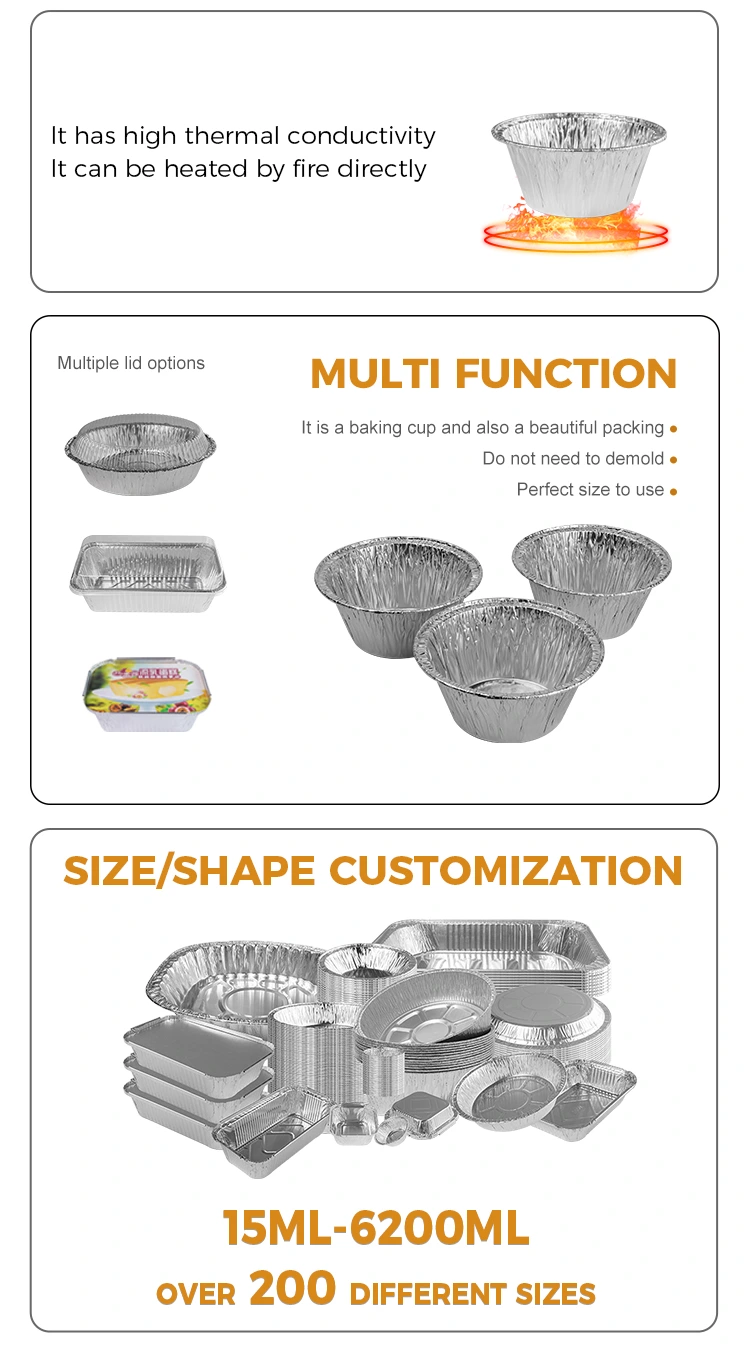 Deuxièmement, pendant la cuisson, le récipient de récipient alimentaire en aluminium en aluminium en aluminium en aluminium excelle. Il a une bonne conductivité thermique et peut répartir uniformément la chaleur pendant la cuisson, en évitant la surchauffe ou les bas brûlants. Dans le même temps, sa stabilité est également très bonne, maintenant la stabilité structurelle même dans des environnements à haute température et ne se déformant pas facilement.
