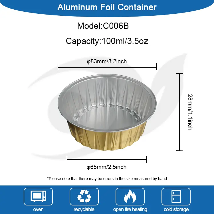 Fournisseurs en aluminium Yunchu Permeaux à gâteaux ronds Lémires de boulangerie lisse en aluminium en aluminium Conteneurs Le C006B est une mousse principale de taille moyenne et de taille moyenne, des produits de boulangerie sur mesure en aluminium en aluminium en aluminium en aluminium en aluminium, la capacité est toujours là, très adaptée à, gâteau au fromage, gâteau de mousse, tiramisu, pudding en gelée, pâtes et autres usage d'emballages alimentaires. Par rapport aux tasses en aluminium en aluminium à petite capacité qui sont souvent observées, la conception de 100 ml peut fournir un espace assorti très riche, qui est très adapté aux cafés, à la vente de desserts et à la permettre aux consommateurs d'acheter et de manger immédiatement.