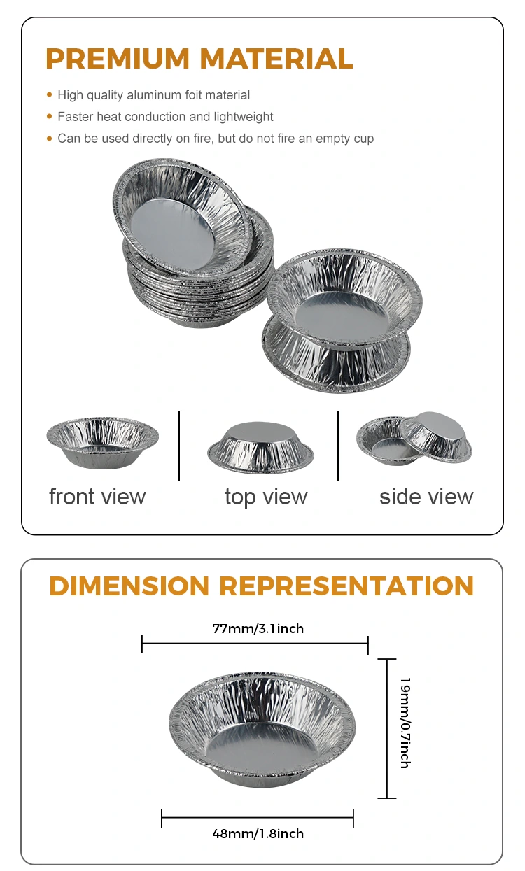Cette tarte à œufs ronde pour les collations en aluminium argent en aluminium en papier d'aluminium alimentaire est composé de 8011 Contact alimentaire Matière en aluminium, assurant la sécurité en contact avec les aliments, pas facile à déformer et pas facile à fuir. Son épaisseur est forte, résistante à la corrosion, une résistance à haute température et une durée de vie plus longue.