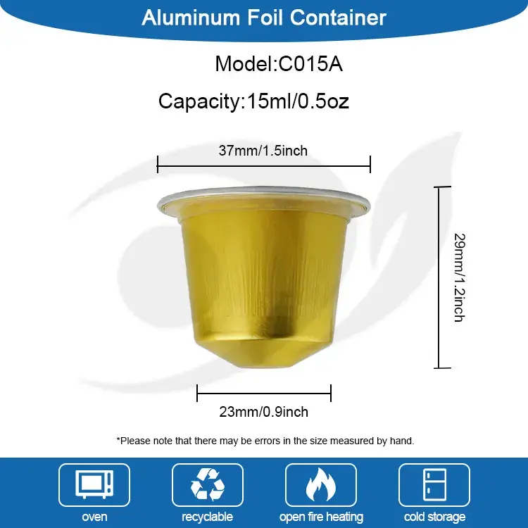 Fournisseur de papier d'aluminium Yunchu Silicone-Seal Capsule de café vide C015A dans les tailles suivantes: Diamètre supérieur 37 mm (environ 1,4 pouces), diamètre de base 23 mm (environ 0,9 pouces), hauteur 29 mm (environ 1,1 pouces). Cette capsule contient 15 ml (environ 0,5 oz) de café moulu, liquide de café. Convient pour toutes les machines Nespresso, le liquide d'expresso emballé et peut même être étendu avec le rinçage de l'azote. De plus, le logo et la couleur peuvent également être personnalisés, et le motif peut être imprimé sur le couvercle en aluminium, et le logo peut également être tamponné au bas de la capsule de café.