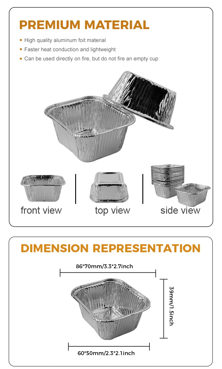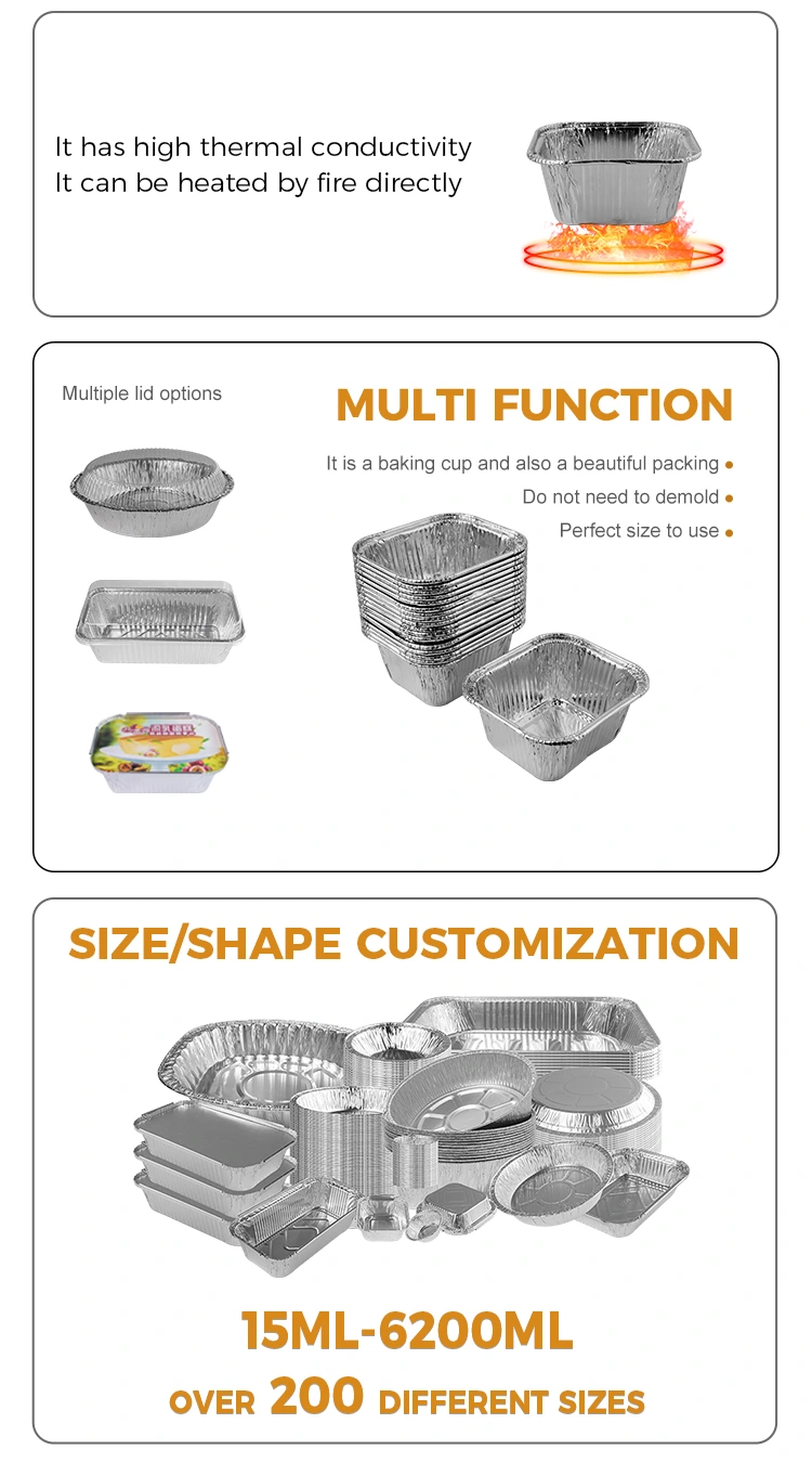 Le récipient en papier d'aluminium en aluer à air carré de boulangerie fournis par le fournisseur de papier d'aluminium Yunchu convient à une variété d'occasions, y compris des friteaux à air, de petits fours à pâtisserie, des plats à emporter et des cafétérias. Il est non seulement adapté à la fabrication de vermicelli d'huîtres, aux haricots rouges de dessert, aux ailes de poulet grillées et aux gâteaux cuites à la vapeur, mais peut également être associé à une variété d'ingrédients, et est largement utilisé dans tous les aspects de l'industrie de la restauration. Le conteneur dispose d'une conception antiadhésive et anti-stick, avec une structure inférieure concave et convexe qui facilite la libération de la moisissure pour la nourriture et maintenir une meilleure apparence. Qu'il s'agisse de griller ou de cuire à la vapeur sur une flamme ouverte, vous pouvez facilement le gérer sans être restreint. Son matériau est robuste et durable, ce qui le rend adapté non seulement à des foyers de fours et d'air, mais aussi dans des grilles ou des vapeur à flammes ouvertes, ce qui est pratique et rapide. De plus, la surface du récipient est lisse et plate, et les bords sont arrondis et pas faciles à gratter les mains, et même s'il y a des plis, il n'affectera pas l'adhérence. Nous proposons une variété de formes de casserole, y compris des styles carrés, ronds et en forme de cœur, pour répondre à vos divers besoins. Si vous êtes intéressé, n'hésitez pas à consulter notre personnel du service client pour plus de détails.